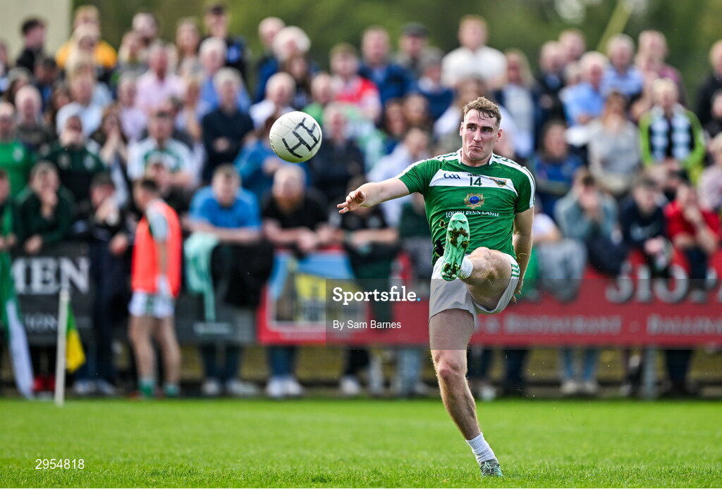 6 October 2024; Keith Beirne of Mohill kicks a free during the Leitrim County Senior Club Football Championship final match between Ballinamore Sean O'Heslins and Mohill at Ballinamore Sean O'Heslins GAA Club in Leitrim. Photo by Sam Barnes/Sportsfile