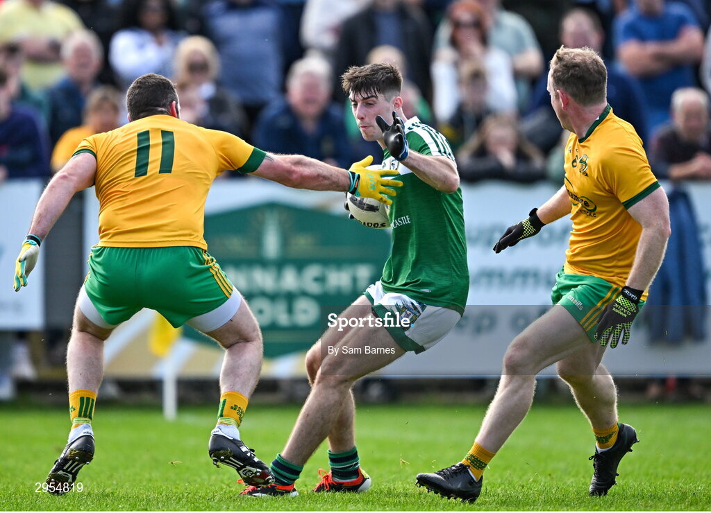 6 October 2024; Sean Harkin of Mohill in action against Wayne McKeon, left, and Liam Ferguson of Ballinamore Sean O'Heslins during the Leitrim County Senior Club Football Championship final match between Ballinamore Sean O'Heslins and Mohill at Ballinamore Sean O'Heslins GAA Club in Leitrim. Photo by Sam Barnes/Sportsfile