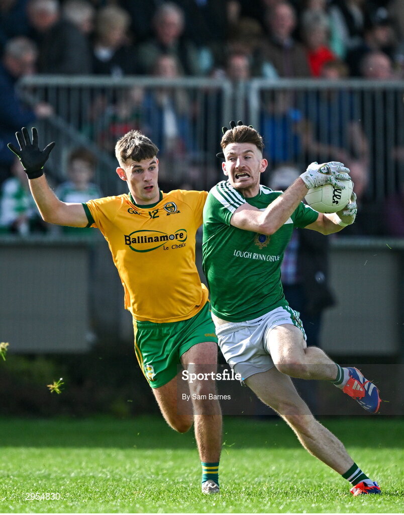 6 October 2024; Shane Quinn of Mohill in action against Paul Moran of Ballinamore Sean O'Heslins during the Leitrim County Senior Club Football Championship final match between Ballinamore Sean O'Heslins and Mohill at Ballinamore Sean O'Heslins GAA Club in Leitrim. Photo by Sam Barnes/Sportsfile