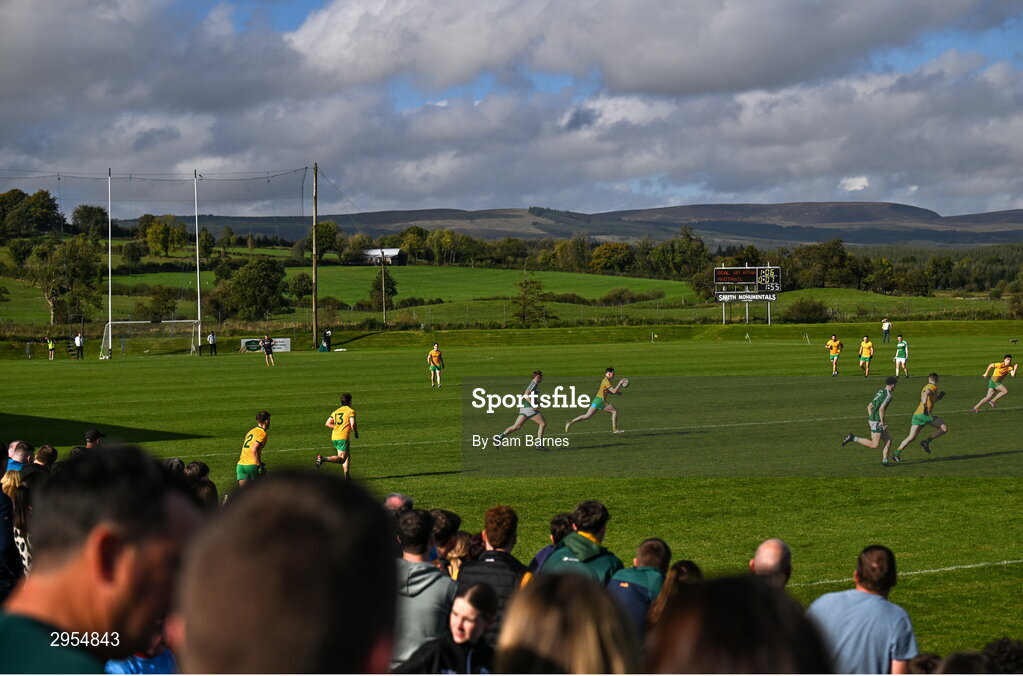 6 October 2024; Michael McBrien of Ballinamore Sean O'Heslins breaks away from Keith Keegan of Mohill during the Leitrim County Senior Club Football Championship final match between Ballinamore Sean O'Heslins and Mohill at Ballinamore Sean O'Heslins GAA Club in Leitrim. Photo by Sam Barnes/Sportsfile