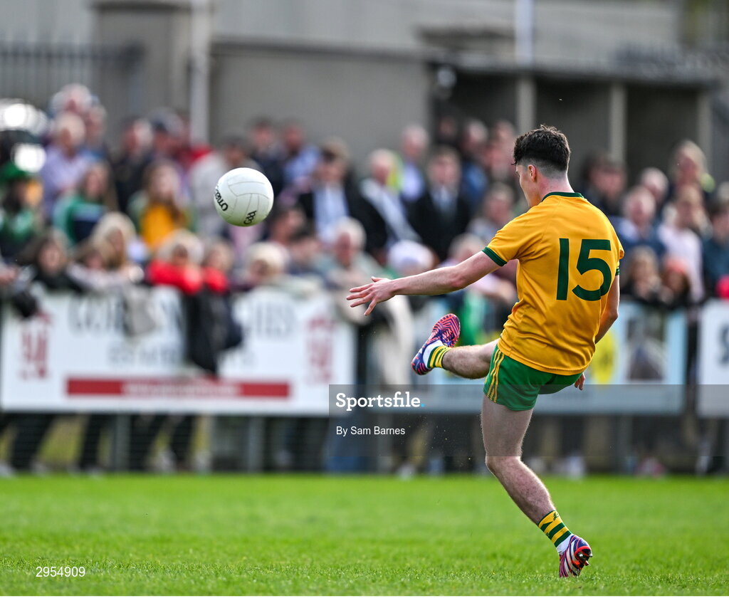 6 October 2024; Paul Honeyman of Ballinamore Sean O'Heslins scores a free to take the lead during the Leitrim County Senior Club Football Championship final match between Ballinamore Sean O'Heslins and Mohill at Ballinamore Sean O'Heslins GAA Club in Leitrim. Photo by Sam Barnes/Sportsfile