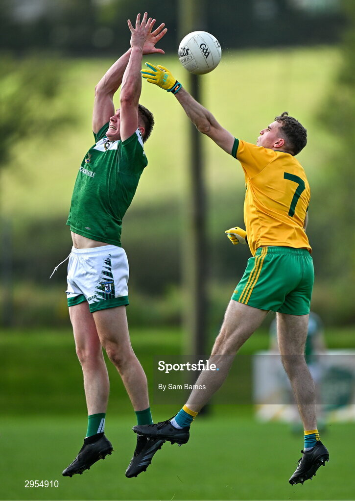 6 October 2024; Keith Keegan of Mohill and Cathal McHugh of Ballinamore Sean O'Heslins contest a high ball during the Leitrim County Senior Club Football Championship final match between Ballinamore Sean O'Heslins and Mohill at Ballinamore Sean O'Heslins GAA Club in Leitrim. Photo by Sam Barnes/Sportsfile