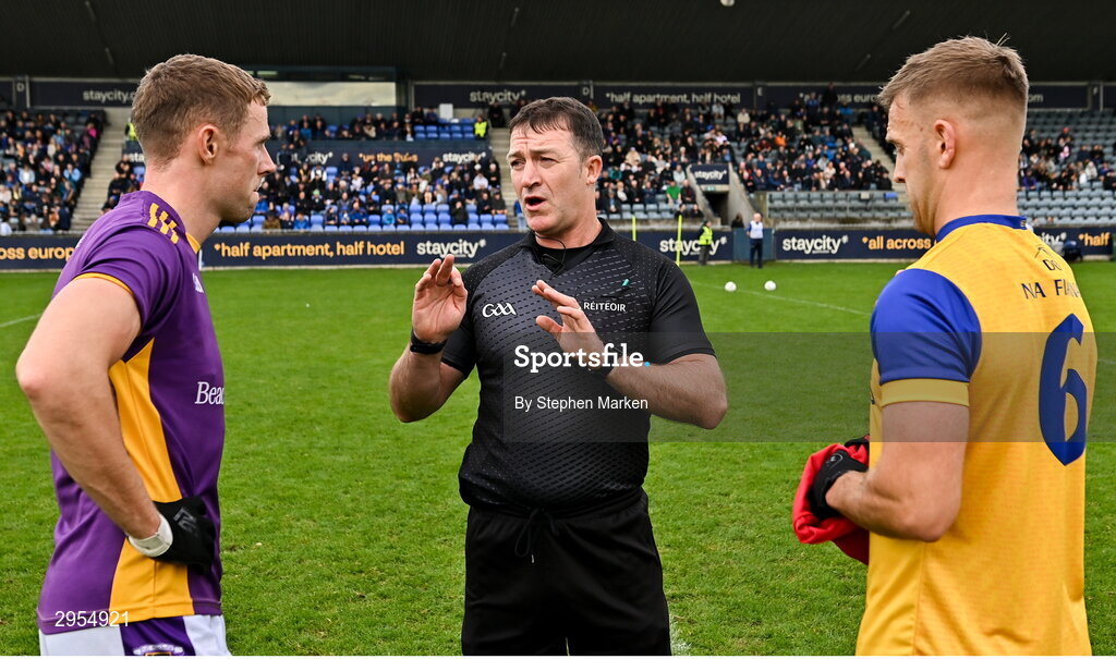 6 October 2024; From left, Paul Mannion of Kilmacud Crokes, referee Darren Delaney and Johnny Cooper of Na Fianna before the Dublin County Senior Club Football Championship semi-final match between Kilmacud Crokes and Na Fianna at Parnell Park in Dublin. Photo by Stephen Marken/Sportsfile