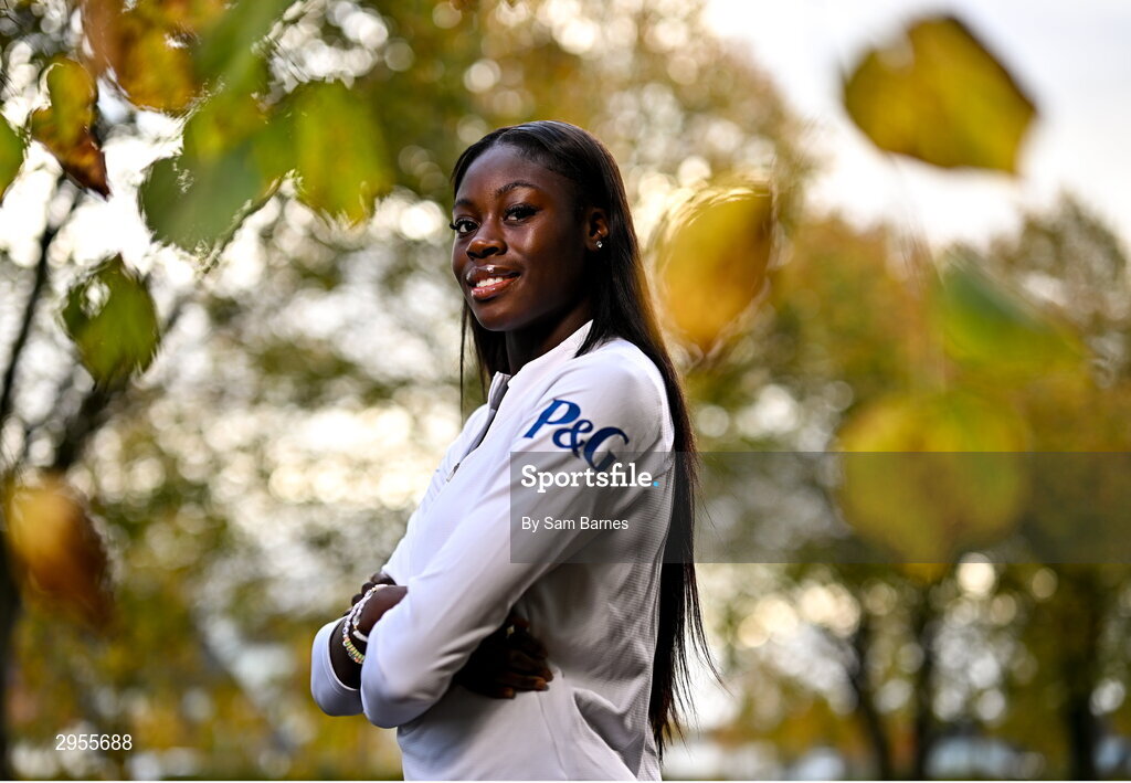7 October 2024; Irish Olympic athlete and P&G Ambassador Rhasidat Adeleke poses for a portrait at the National Indoor Arena on the Sport Ireland Campus in Dublin. Rhasidat hosted an intimate training session today giving guests an insight into what her day-to-day training involves. Photo by Sam Barnes/Sportsfile