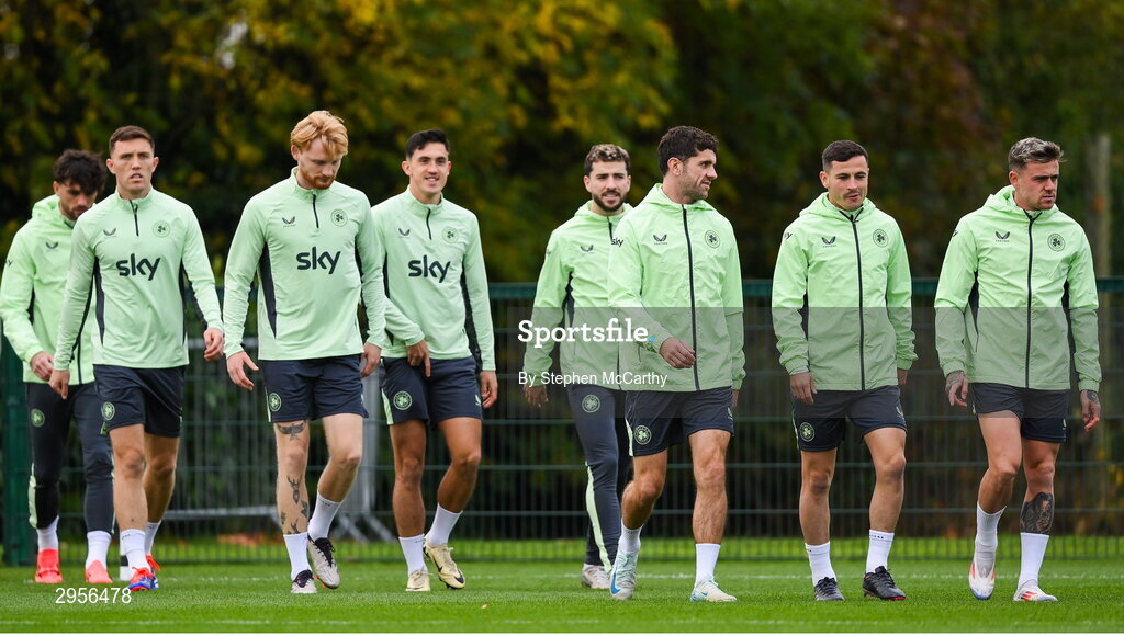 8 October 2024; Republic of Ireland players, from left, Troy Parrott, Dara O'Shea, Liam Scales, Jamie McGrath, Mikey Johnston, Robbie Brady, Josh Cullen and Sammie Szmodics during a Republic of Ireland training session at the FAI National Training Centre in Abbotstown, Dublin. Photo by Stephen McCarthy/Sportsfile