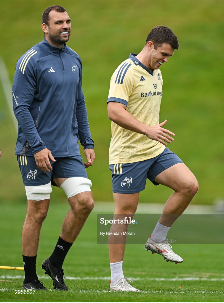 8 October 2024; Tom Farrell, right, and Tadhg Beirne during Munster rugby squad training at University of Limerick in Limerick. Photo by Brendan Moran/Sportsfile
