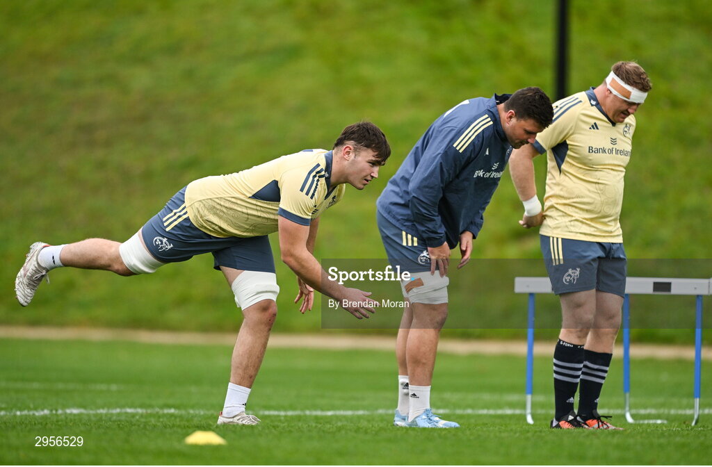 8 October 2024; Ruadhan Quinn, left, during Munster rugby squad training at University of Limerick in Limerick. Photo by Brendan Moran/Sportsfile