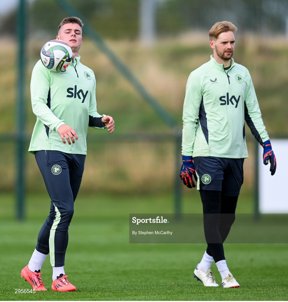 8 October 2024; Evan Ferguson, left, and Caoimhin Kelleher during a Republic of Ireland training session at the FAI National Training Centre in Abbotstown, Dublin. Photo by Stephen McCarthy/Sportsfile