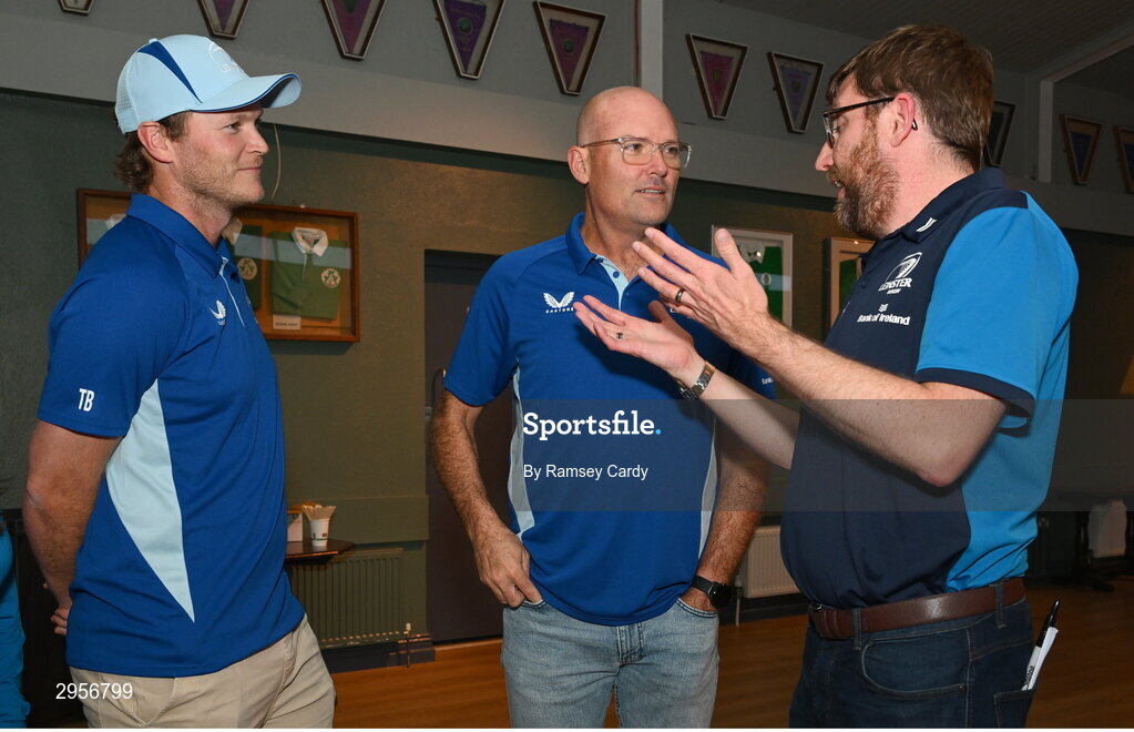 8 October 2024; Assistant coach Tyler Bleyendaal and Senior coach Jacques Nienaber with OLSC President Alan Mooney during a Leinster Rugby Supporters Q&A at Bective Rangers RFC in Dublin. Photo by Ramsey Cardy/Sportsfile