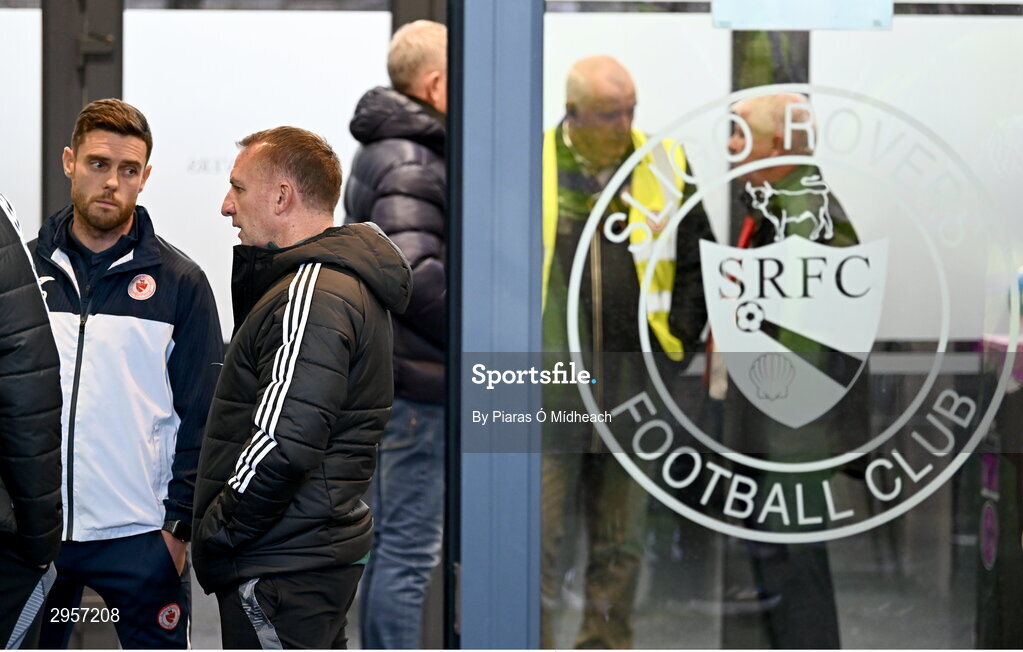 9 October 2024; Sligo Rovers manager John Russell, left, and Celtic manager Brendan Rodgers in conversation before the mid-season friendly match between Sligo Rovers and Celtic FC at The Showgrounds in Sligo. Photo by Piaras Ó Mídheach/Sportsfile