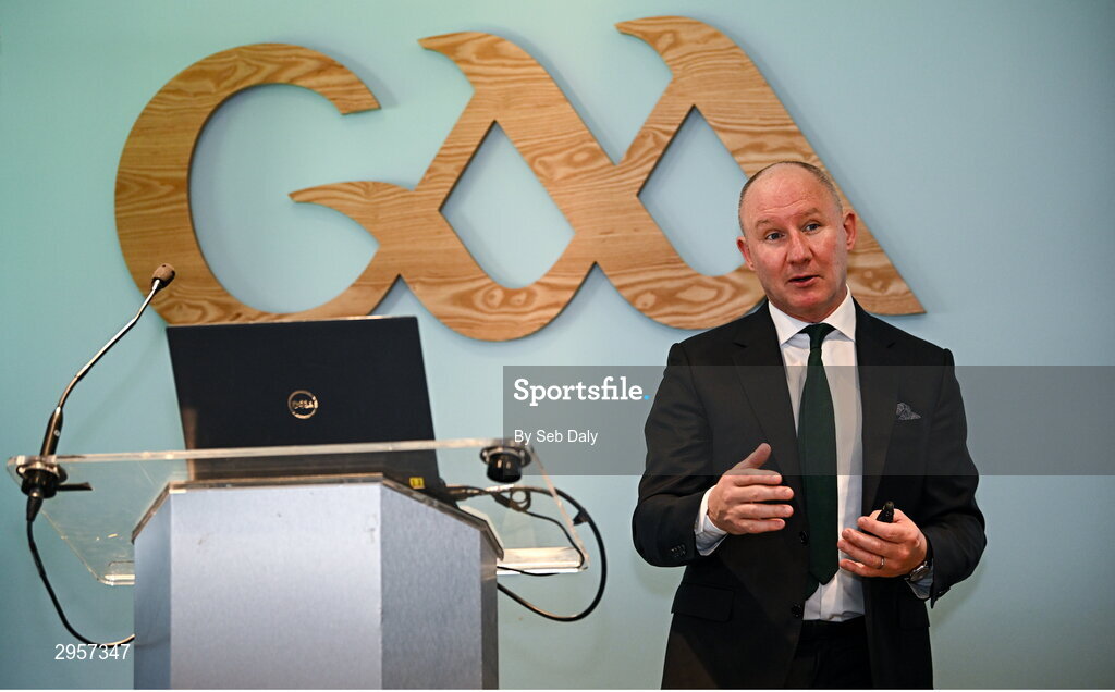 10 October 2024; GAA Football Review Committee chairperson Jim Gavin speaking during a briefing of the GAA Football Review Committee at Croke Park in Dublin. Photo by Seb Daly/Sportsfile