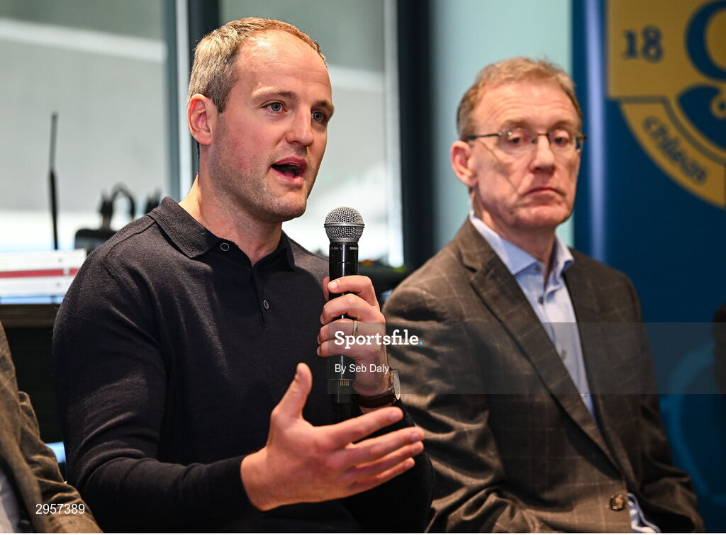 10 October 2024; GAA Football Review Committee member Michael Murphy, left, speaking during a briefing of the GAA Football Review Committee at Croke Park in Dublin. Photo by Seb Daly/Sportsfile