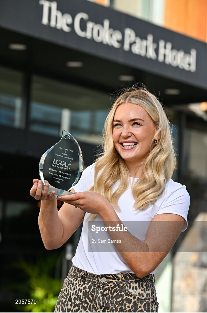 10 October 2024; Eimear McAnespie from Monaghan club Emyvale is pictured with The Croke Park Hotel/LGFA Player of the Month award for September 2024, at The Croke Park Hotel on Jones Road in Dublin. Eimear captained Emyvale to a first county senior title on September 29, producing a player of the match display in the process. Photo by Sam Barnes/Sportsfile