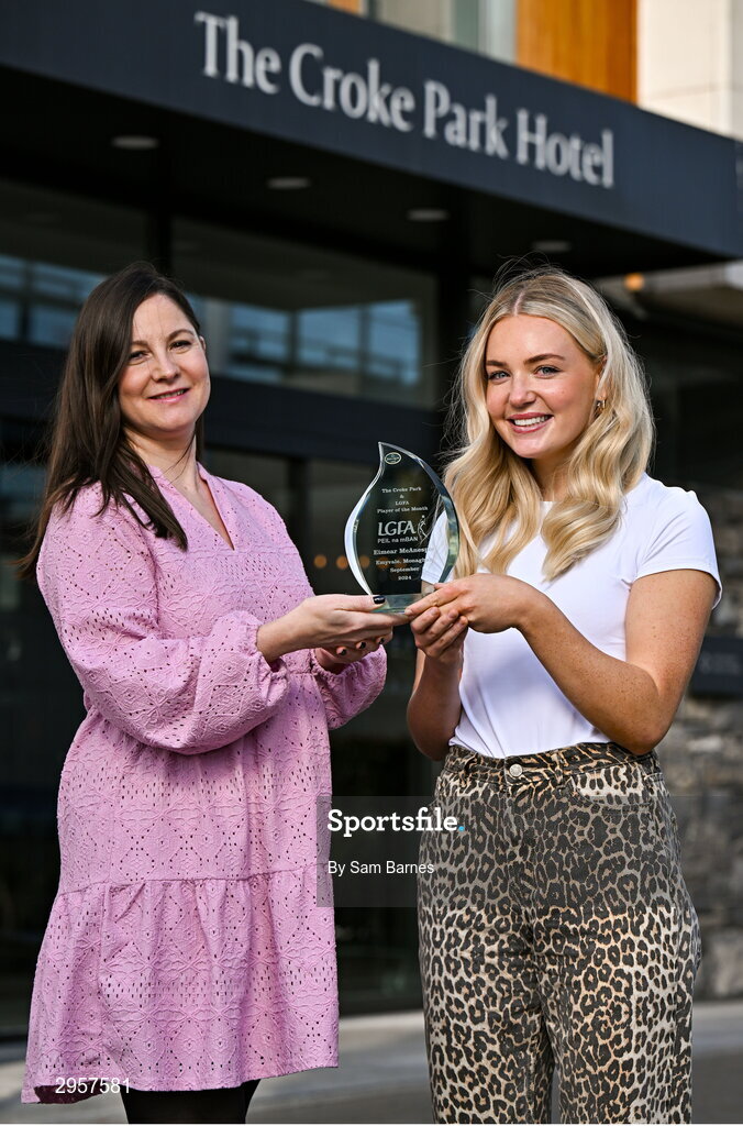 10 October 2024; Eimear McAnespie from Monaghan club Emyvale is presented with The Croke Park Hotel/LGFA Player of the Month award for September 2024 by Ina Lazar, Assistant Director of Sales, The Croke Park Hotel, at The Croke Park Hotel on Jones Road in Dublin. Eimear captained Emyvale to a first county senior title on September 29, producing a player of the match display in the process. Photo by Sam Barnes/Sportsfile