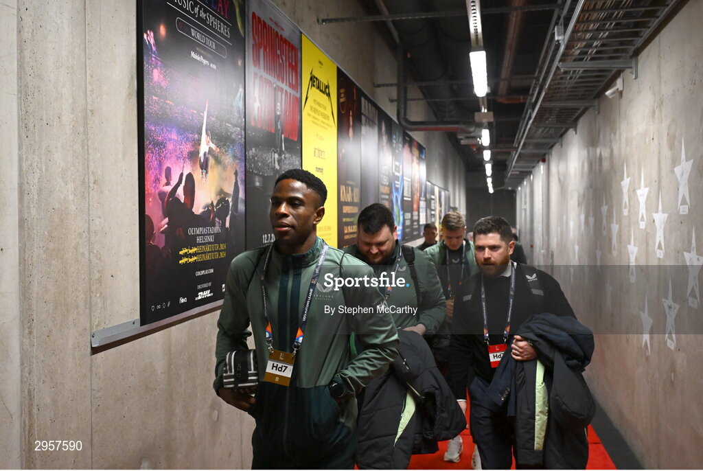 10 October 2024; Chiedozie Ogbene of Republic of Ireland arrives before the UEFA Nations League B Group 2 match between Finland and Republic of Ireland at the Helsinki Olympic Stadium in Helsinki, Finland. Photo by Stephen McCarthy/Sportsfile