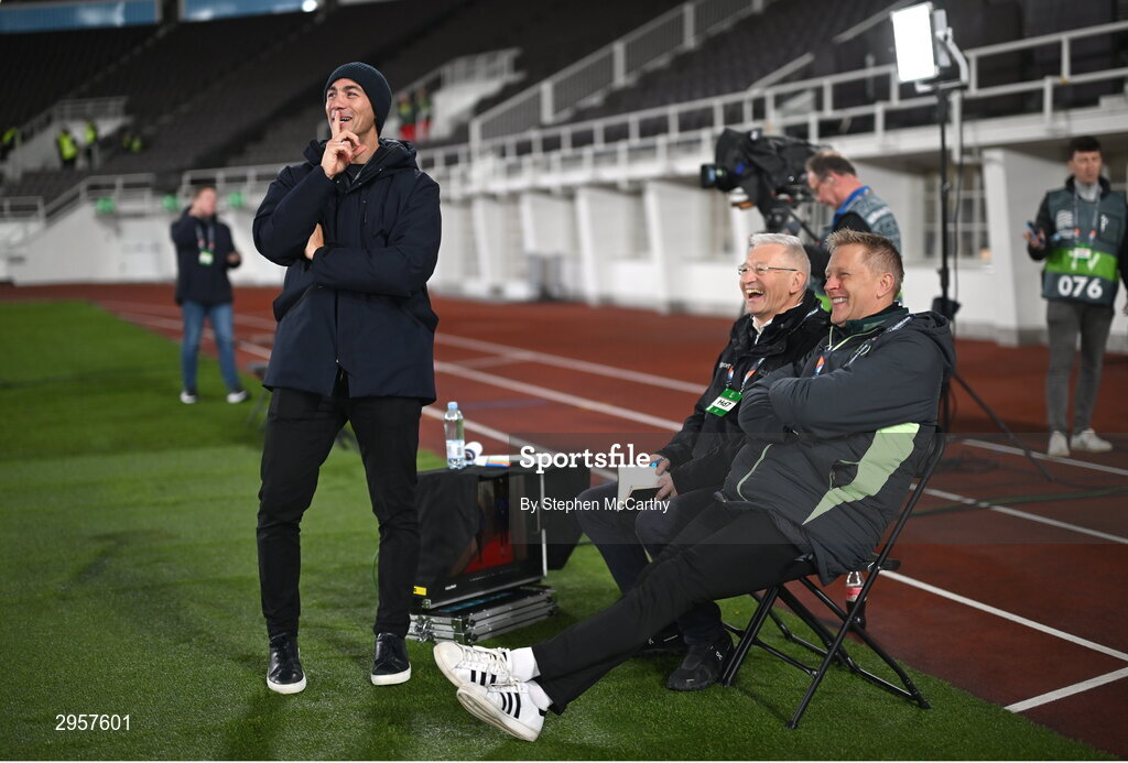 10 October 2024; Republic of Ireland head coach Heimir Hallgrimsson, right, with RTÉ's Stephen Kelly, left, and Tony O'Donoghue before the UEFA Nations League B Group 2 match between Finland and Republic of Ireland at the Helsinki Olympic Stadium in Helsinki, Finland. Photo by Stephen McCarthy/Sportsfile