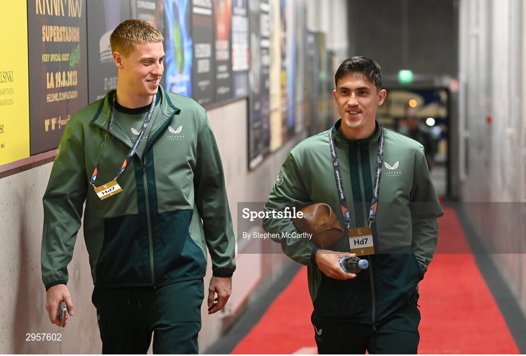 10 October 2024; Mark McGuinness, left, and Jamie McGrath of Republic of Ireland arrive before the UEFA Nations League B Group 2 match between Finland and Republic of Ireland at the Helsinki Olympic Stadium in Helsinki, Finland. Photo by Stephen McCarthy/Sportsfile
