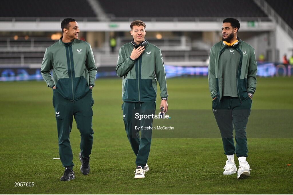 10 October 2024; Republic of Ireland players, from left, Adam Idah, Kasey McAteer and Andrew Omobamidele before the UEFA Nations League B Group 2 match between Finland and Republic of Ireland at the Helsinki Olympic Stadium in Helsinki, Finland. Photo by Stephen McCarthy/Sportsfile