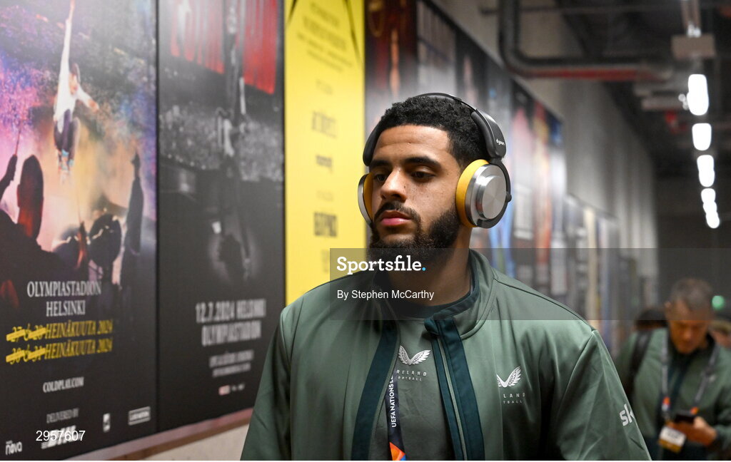 10 October 2024; Andrew Omobamidele of Republic of Ireland arrives before the UEFA Nations League B Group 2 match between Finland and Republic of Ireland at the Helsinki Olympic Stadium in Helsinki, Finland. Photo by Stephen McCarthy/Sportsfile