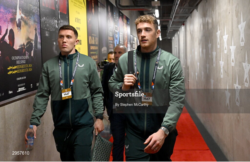 10 October 2024; Republic of Ireland goalkeeper Mark Travers, right, and Dara O'Shea of Republic of Ireland arrive before the UEFA Nations League B Group 2 match between Finland and Republic of Ireland at the Helsinki Olympic Stadium in Helsinki, Finland. Photo by Stephen McCarthy/Sportsfile