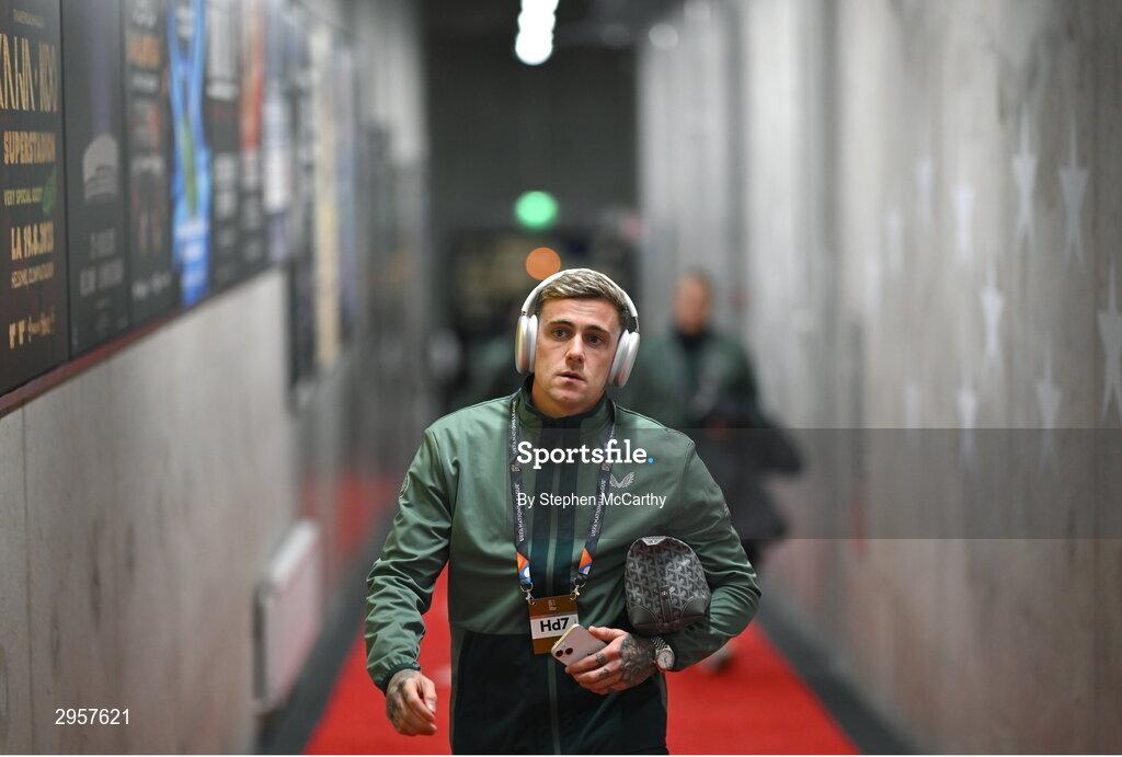 10 October 2024; Sammie Szmodics of Republic of Ireland arrives before the UEFA Nations League B Group 2 match between Finland and Republic of Ireland at the Helsinki Olympic Stadium in Helsinki, Finland. Photo by Stephen McCarthy/Sportsfile