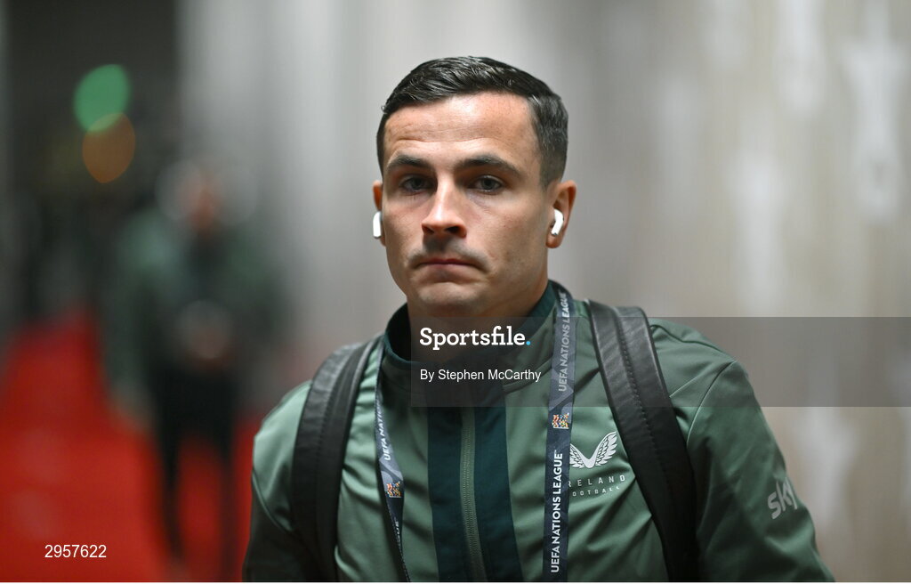 10 October 2024; Josh Cullen of Republic of Ireland arrives before the UEFA Nations League B Group 2 match between Finland and Republic of Ireland at the Helsinki Olympic Stadium in Helsinki, Finland. Photo by Stephen McCarthy/Sportsfile