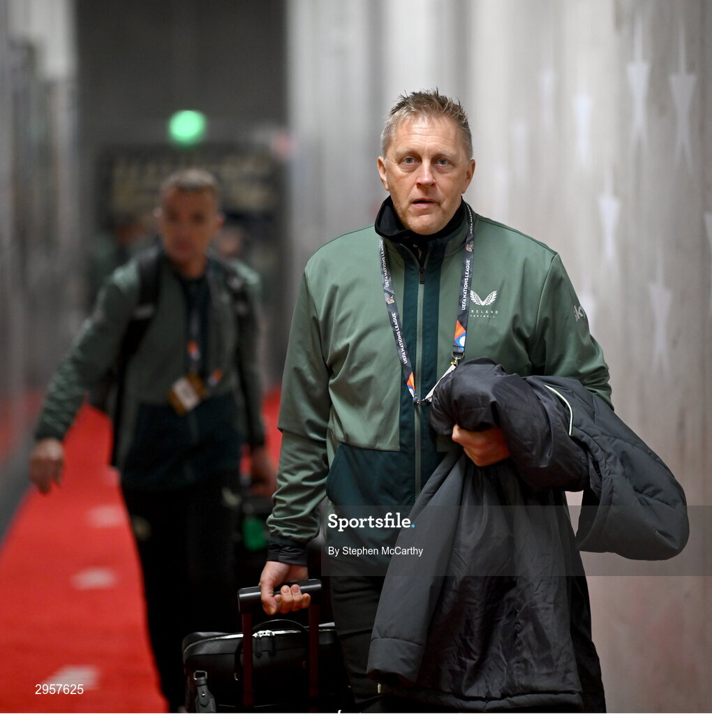 10 October 2024; Republic of Ireland head coach Heimir Hallgrimsson arrives before the UEFA Nations League B Group 2 match between Finland and Republic of Ireland at the Helsinki Olympic Stadium in Helsinki, Finland. Photo by Stephen McCarthy/Sportsfile