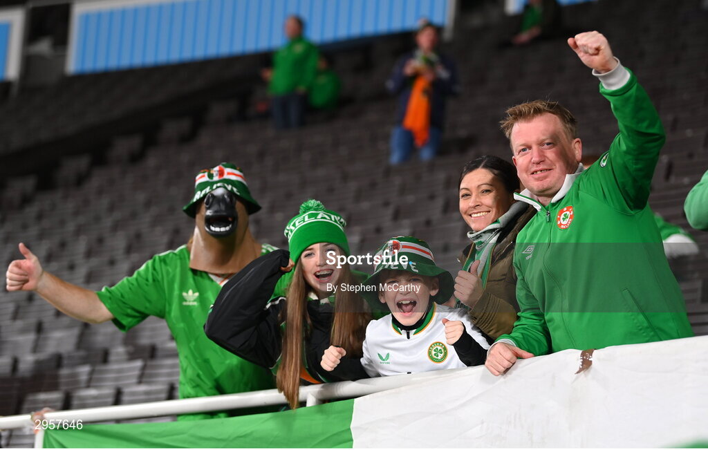 10 October 2024; Republic of Ireland supporters before the UEFA Nations League B Group 2 match between Finland and Republic of Ireland at the Helsinki Olympic Stadium in Helsinki, Finland. Photo by Stephen McCarthy/Sportsfile