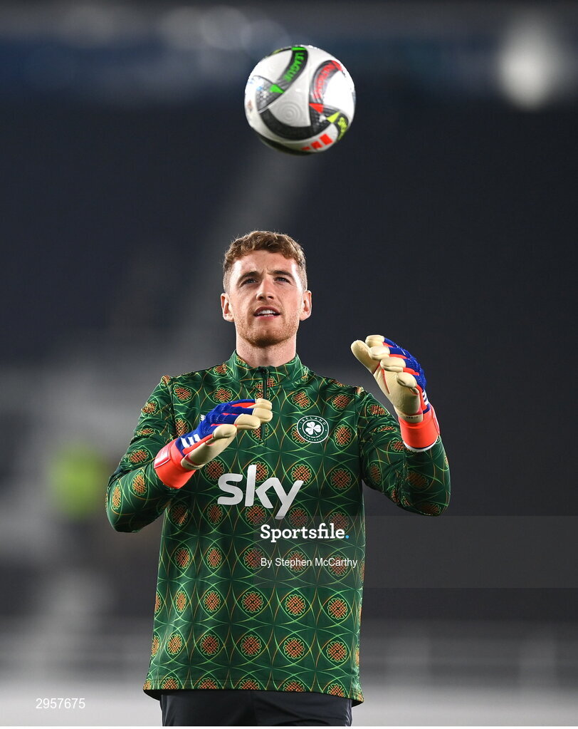 10 October 2024; Republic of Ireland goalkeeper Mark Travers before the UEFA Nations League B Group 2 match between Finland and Republic of Ireland at the Helsinki Olympic Stadium in Helsinki, Finland. Photo by Stephen McCarthy/Sportsfile