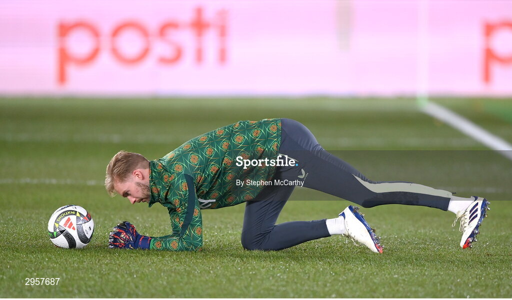 10 October 2024; Republic of Ireland goalkeeper Caoimhin Kelleher before the UEFA Nations League B Group 2 match between Finland and Republic of Ireland at the Helsinki Olympic Stadium in Helsinki, Finland. Photo by Stephen McCarthy/Sportsfile