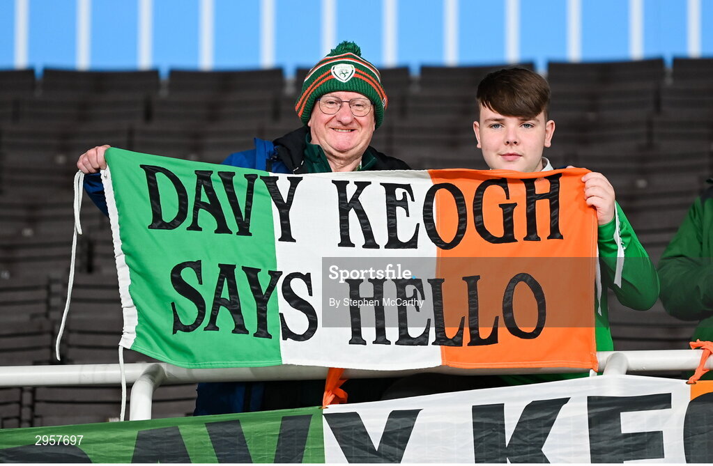 10 October 2024; Republic of Ireland supporters Davy Keogh, left, and Ryan Farrell before the UEFA Nations League B Group 2 match between Finland and Republic of Ireland at the Helsinki Olympic Stadium in Helsinki, Finland. Photo by Stephen McCarthy/Sportsfile
