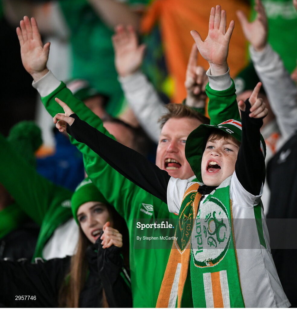 10 October 2024; Republic of Ireland supporters, from right, Charlie, Andrew and Faye Whelan before the UEFA Nations League B Group 2 match between Finland and Republic of Ireland at the Helsinki Olympic Stadium in Helsinki, Finland. Photo by Stephen McCarthy/Sportsfile