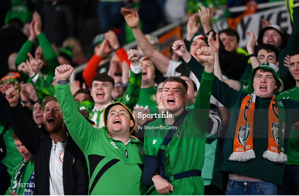 10 October 2024; Republic of Ireland supporters before the UEFA Nations League B Group 2 match between Finland and Republic of Ireland at the Helsinki Olympic Stadium in Helsinki, Finland. Photo by Stephen McCarthy/Sportsfile
