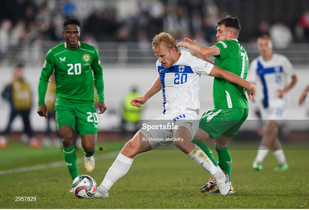 10 October 2024; Joel Pohjanpalo of Finland in action against Jason Knight of Republic of Ireland during the UEFA Nations League B Group 2 match between Finland and Republic of Ireland at the Helsinki Olympic Stadium in Helsinki, Finland. Photo by Stephen McCarthy/Sportsfile