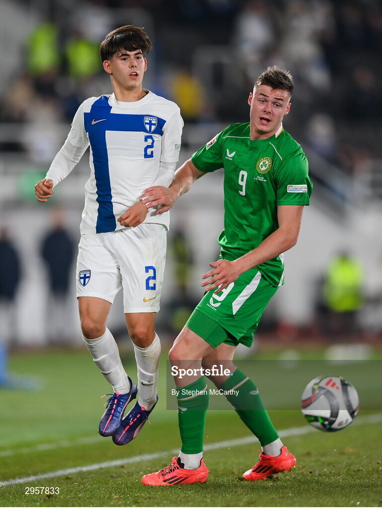 10 October 2024; Tomas Galvez of Finland in action against Evan Ferguson of Republic of Ireland during the UEFA Nations League B Group 2 match between Finland and Republic of Ireland at the Helsinki Olympic Stadium in Helsinki, Finland. Photo by Stephen McCarthy/Sportsfile