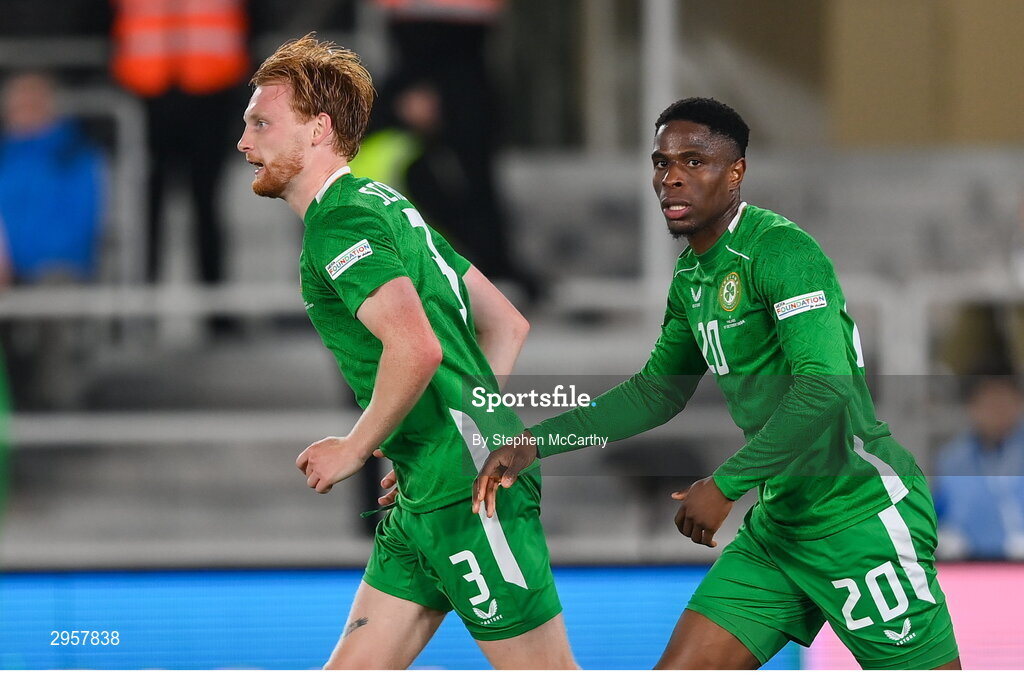 10 October 2024; Liam Scales of Republic of Ireland celebrates with Chiedozie Ogbene, right, after scoring their side's first goal during the UEFA Nations League B Group 2 match between Finland and Republic of Ireland at the Helsinki Olympic Stadium in Helsinki, Finland. Photo by Stephen McCarthy/Sportsfile