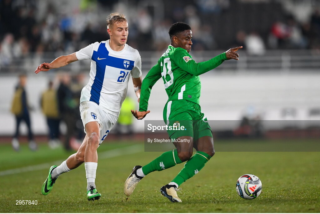 10 October 2024; Chiedozie Ogbene of Republic of Ireland in action against Topi Keskinen of Finland during the UEFA Nations League B Group 2 match between Finland and Republic of Ireland at the Helsinki Olympic Stadium in Helsinki, Finland. Photo by Stephen McCarthy/Sportsfile