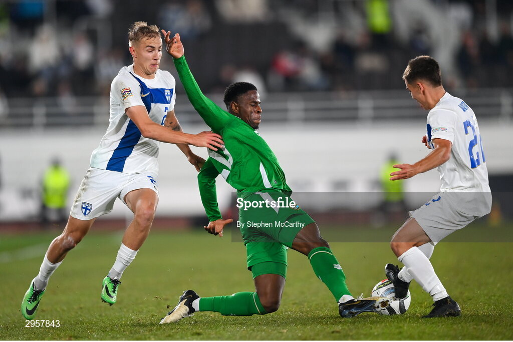 10 October 2024; Chiedozie Ogbene of Republic of Ireland in action against Topi Keskinen, left, and Leo Walta of Finland during the UEFA Nations League B Group 2 match between Finland and Republic of Ireland at the Helsinki Olympic Stadium in Helsinki, Finland. Photo by Stephen McCarthy/Sportsfile