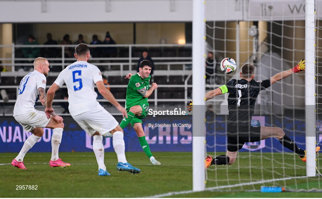 10 October 2024; Robbie Brady of Republic of Ireland scores his side's second goal during the UEFA Nations League B Group 2 match between Finland and Republic of Ireland at the Helsinki Olympic Stadium in Helsinki, Finland. Photo by Stephen McCarthy/Sportsfile
