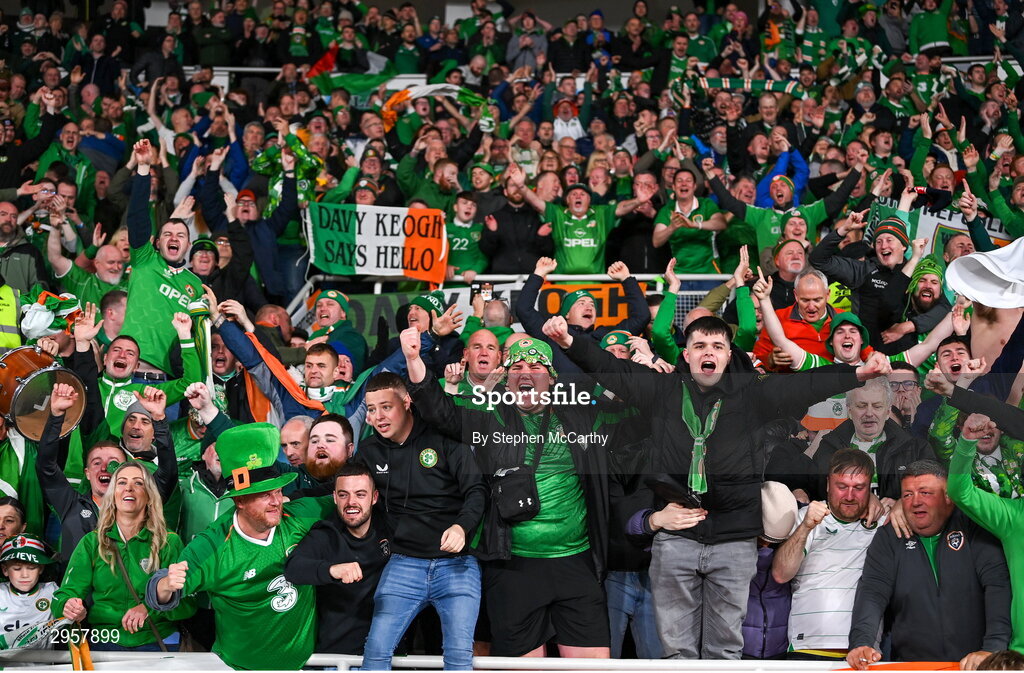 10 October 2024; Republic of Ireland supporters celebrate their side's winning goal, scored by Robbie Brady, not pictured, during the UEFA Nations League B Group 2 match between Finland and Republic of Ireland at the Helsinki Olympic Stadium in Helsinki, Finland. Photo by Stephen McCarthy/Sportsfile