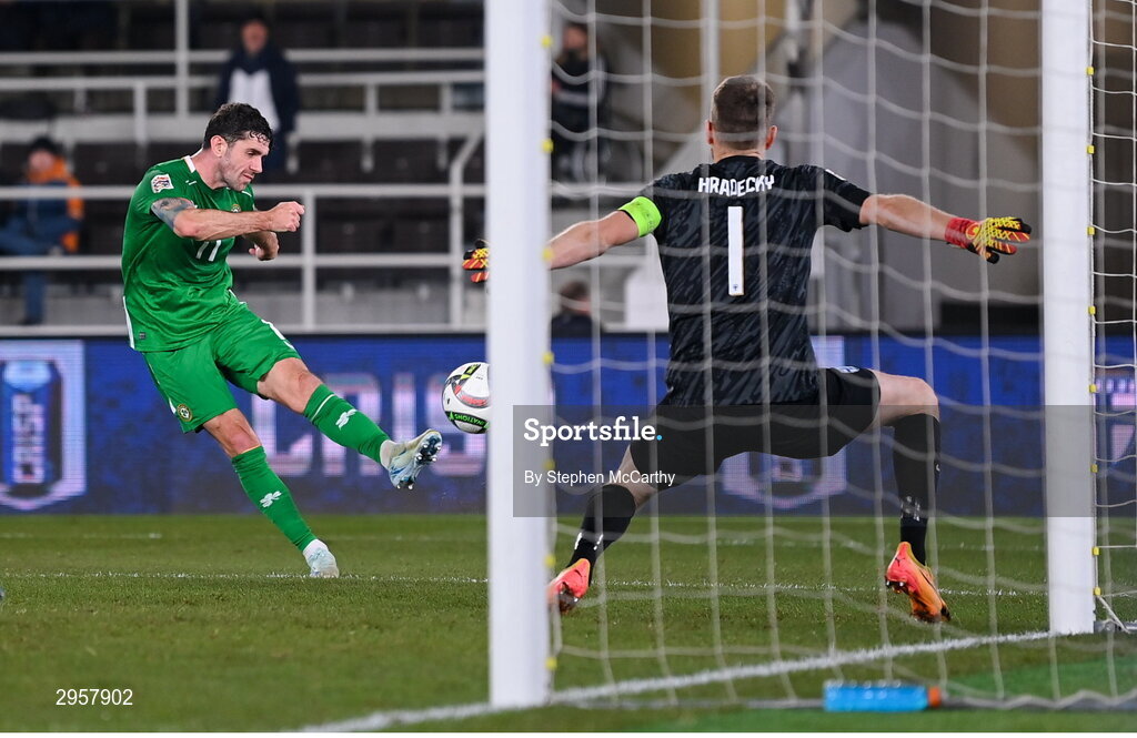 10 October 2024; Robbie Brady of Republic of Ireland scores his side's second goal during the UEFA Nations League B Group 2 match between Finland and Republic of Ireland at the Helsinki Olympic Stadium in Helsinki, Finland. Photo by Stephen McCarthy/Sportsfile