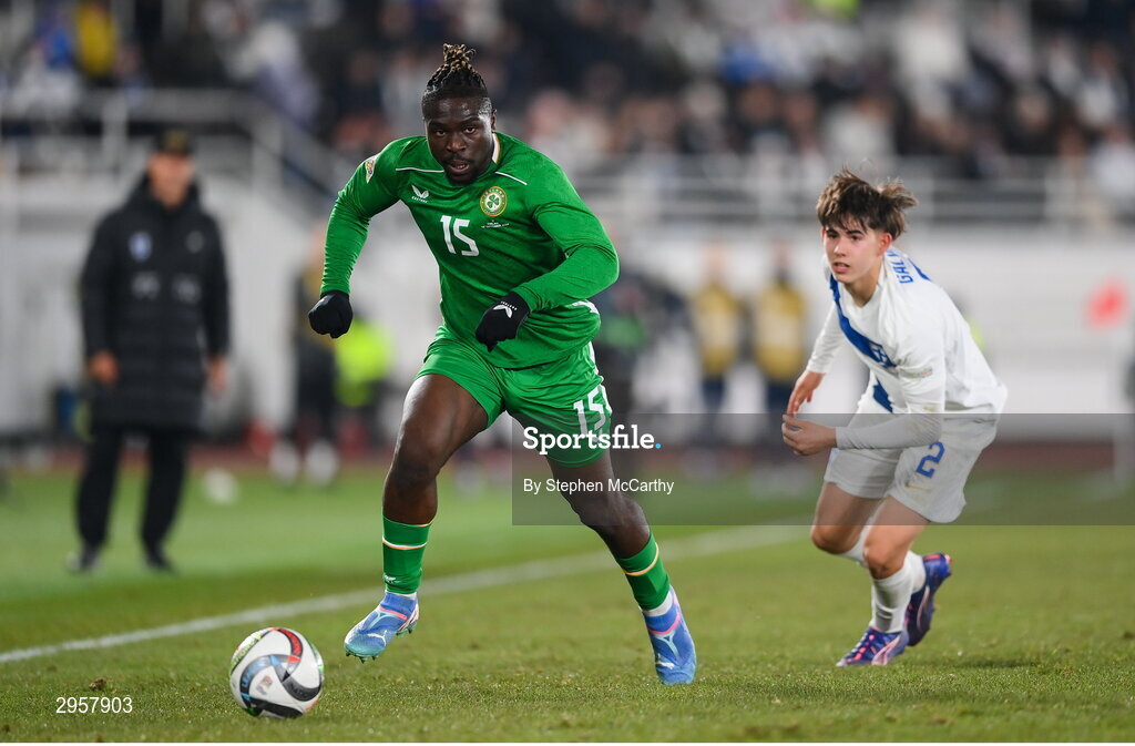 10 October 2024; Festy Ebosele of Republic of Ireland in action against Tomas Galvez of Finland during the UEFA Nations League B Group 2 match between Finland and Republic of Ireland at the Helsinki Olympic Stadium in Helsinki, Finland. Photo by Stephen McCarthy/Sportsfile