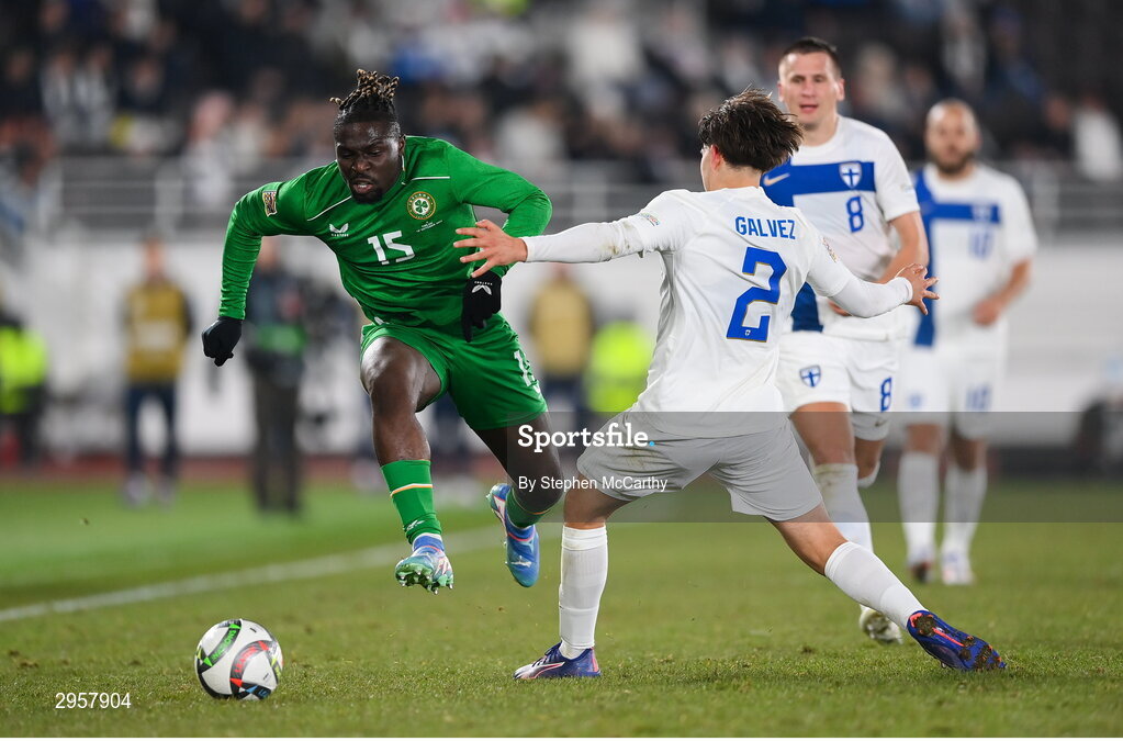 10 October 2024; Festy Ebosele of Republic of Ireland in action against Tomas Galvez of Finland during the UEFA Nations League B Group 2 match between Finland and Republic of Ireland at the Helsinki Olympic Stadium in Helsinki, Finland. Photo by Stephen McCarthy/Sportsfile