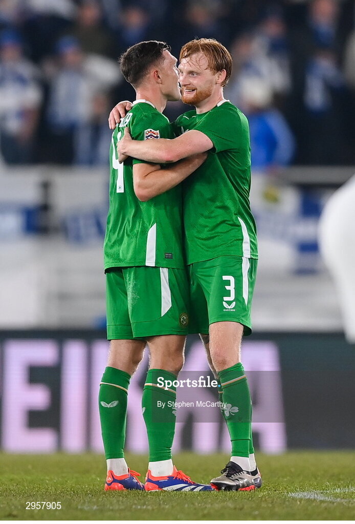 10 October 2024; Liam Scales, right, and Dara O'Shea of Republic of Ireland celebrate at the final whistle of the UEFA Nations League B Group 2 match between Finland and Republic of Ireland at the Helsinki Olympic Stadium in Helsinki, Finland. Photo by Stephen McCarthy/Sportsfile