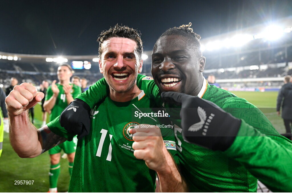 10 October 2024; Robbie Brady, left, and Festy Ebosele of Republic of Ireland celebrate after the UEFA Nations League B Group 2 match between Finland and Republic of Ireland at the Helsinki Olympic Stadium in Helsinki, Finland. Photo by Stephen McCarthy/Sportsfile