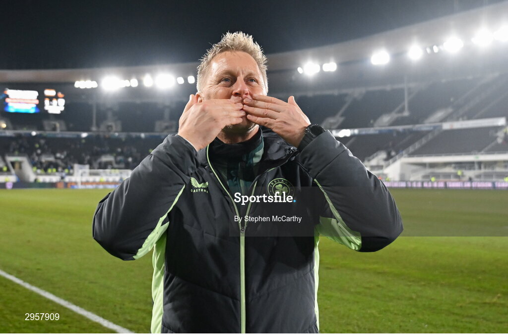 10 October 2024; Republic of Ireland head coach Heimir Hallgrimsson celebrates after the UEFA Nations League B Group 2 match between Finland and Republic of Ireland at the Helsinki Olympic Stadium in Helsinki, Finland. Photo by Stephen McCarthy/Sportsfile