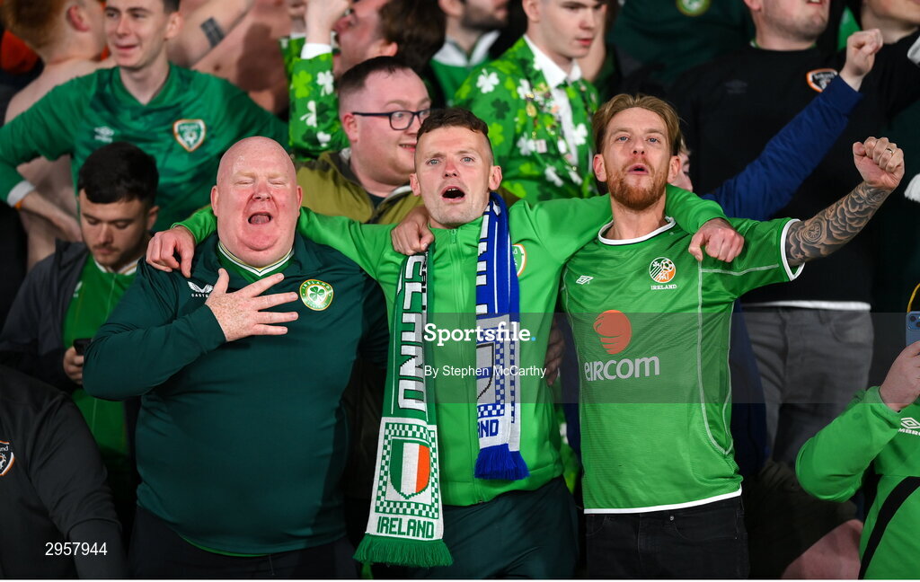 10 October 2024; Republic of Ireland supporters, from left, Patrick Hegarty, Ray Hyland and David Cummins celebrate after the UEFA Nations League B Group 2 match between Finland and Republic of Ireland at the Helsinki Olympic Stadium in Helsinki, Finland. Photo by Stephen McCarthy/Sportsfile
