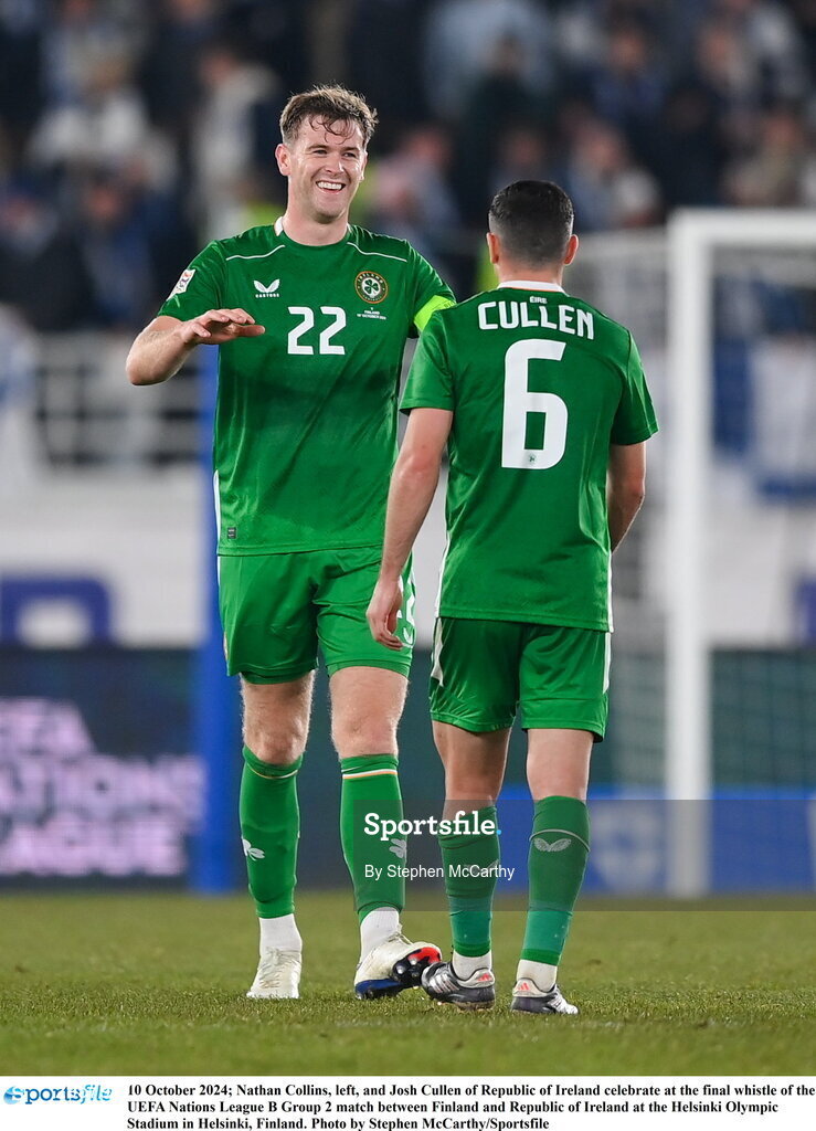 10 October 2024; Nathan Collins, left, and Josh Cullen of Republic of Ireland celebrate at the final whistle of the UEFA Nations League B Group 2 match between Finland and Republic of Ireland at the Helsinki Olympic Stadium in Helsinki, Finland. Photo by Stephen McCarthy/Sportsfile