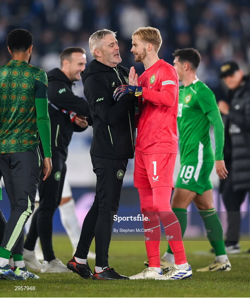 10 October 2024; Republic of Ireland goalkeeper Caoimhin Kelleher celebrates with Republic of Ireland goalkeeping coach Gudmundur Hreidarsson after the UEFA Nations League B Group 2 match between Finland and Republic of Ireland at the Helsinki Olympic Stadium in Helsinki, Finland. Photo by Stephen McCarthy/Sportsfile