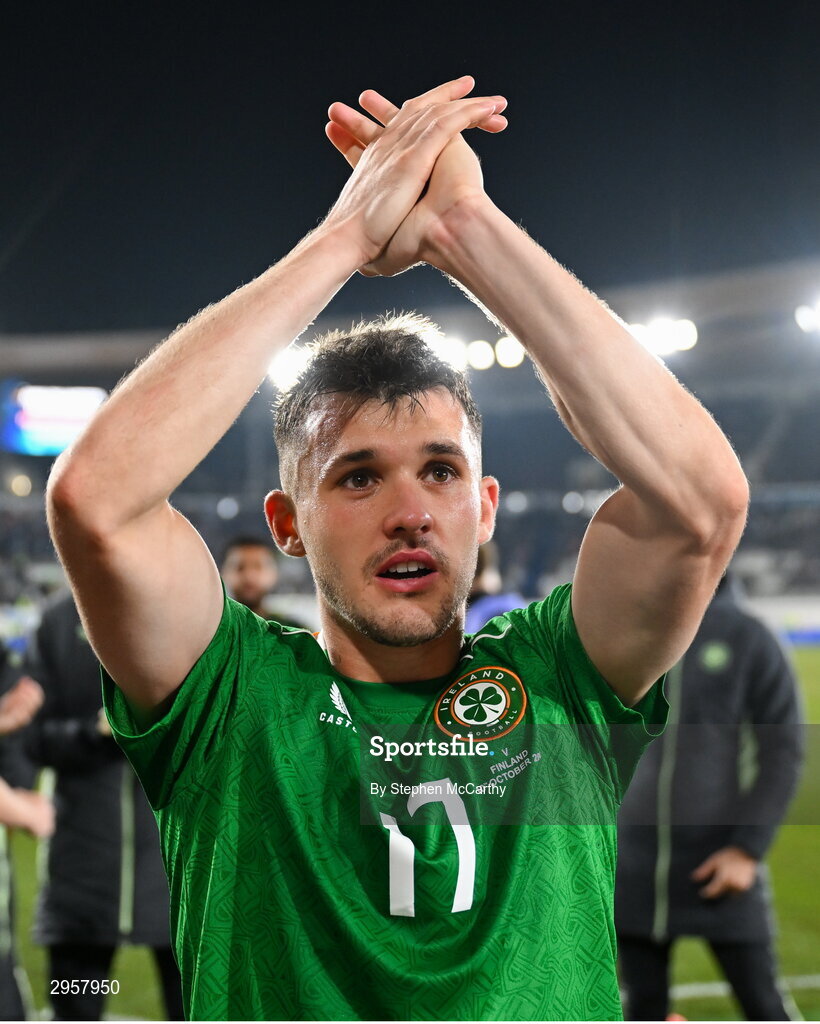 10 October 2024; Jason Knight of Republic of Ireland celebrates after the UEFA Nations League B Group 2 match between Finland and Republic of Ireland at the Helsinki Olympic Stadium in Helsinki, Finland. Photo by Stephen McCarthy/Sportsfile